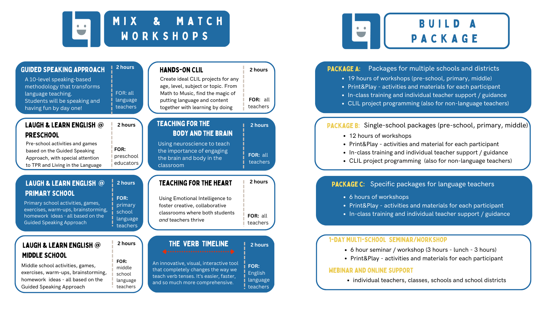 Laugh & Learn offers dynamic, hands-on workshops for school districts and educators (from pre-K to high school). Mix & Match Workshops offer all the support, know-how, innovation and inspiration that is needed to create great learning spaces with happy students and happier teachers.